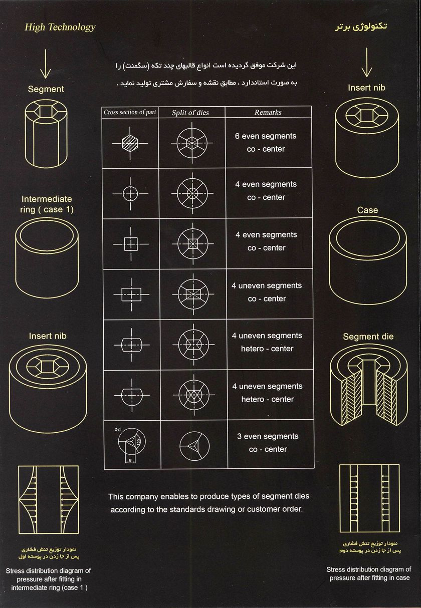 Dies segment called multi-piece dies which put together the few tungsten carbide pieces and put them into the two steel cases. Segment dies at industry has wide applications forms and are simple and complex shapes . In general segment family consists of 3 main groups following : even segments and co- center like square, uneven segments and co- center such as rectangular and uneven segments and hetero-center like rectangular which the two sides are a small part of the circle.